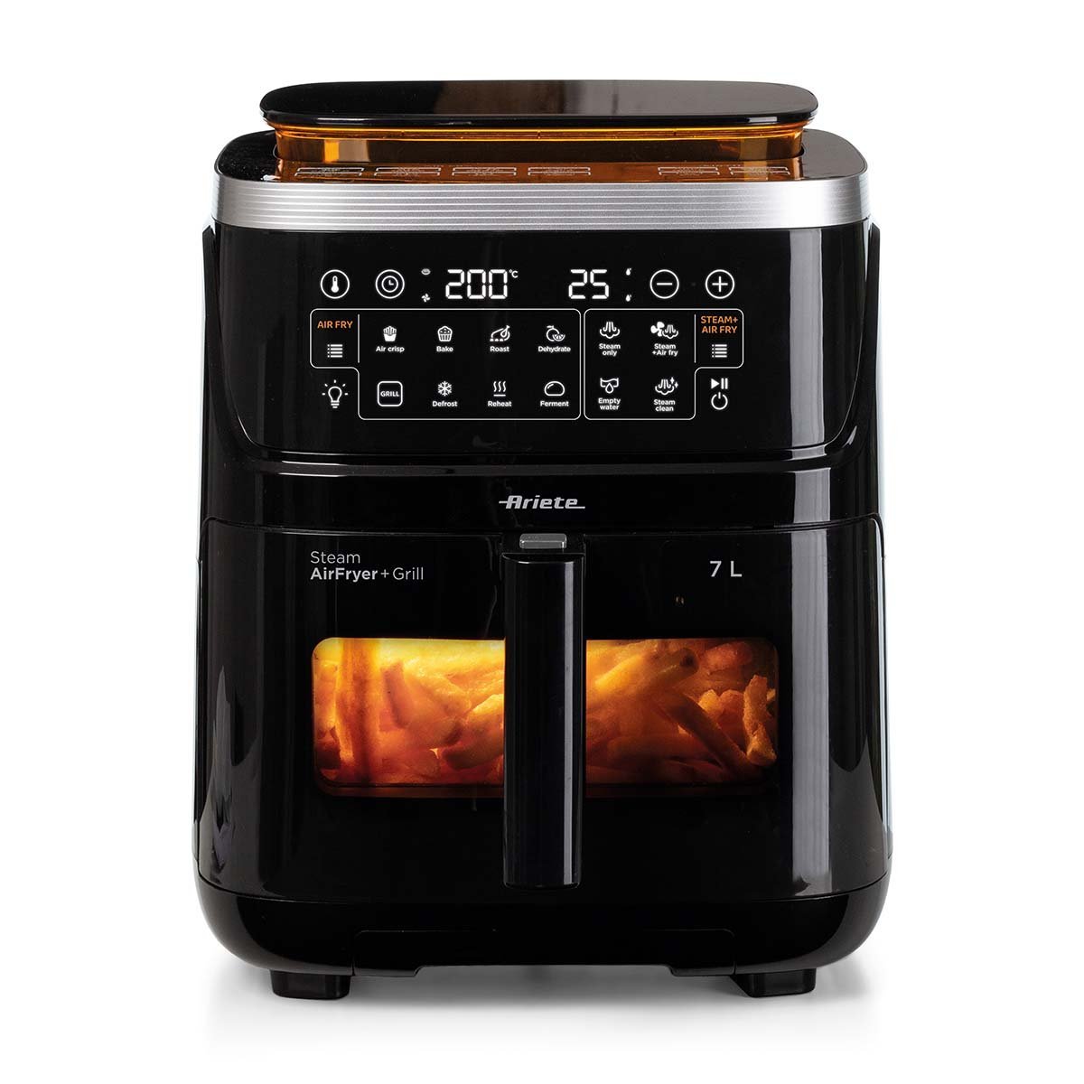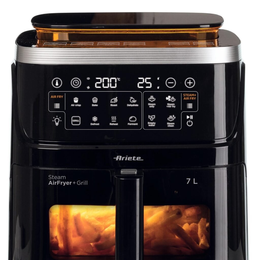 Esta Fritadeira Air Fryer com funções de vapor + grill possui 10 programas de cozimento predefinidos que permitem fritar, grelhar, usar as funções tradicionais de forno, desidratar, assar pizzas e sobremesas, reaquecer, fermentar e cozinhar a vapor. Você pode preparar grandes quantidades graças à capacidade de 7 litros e à temperatura ajustável até 200 °C.