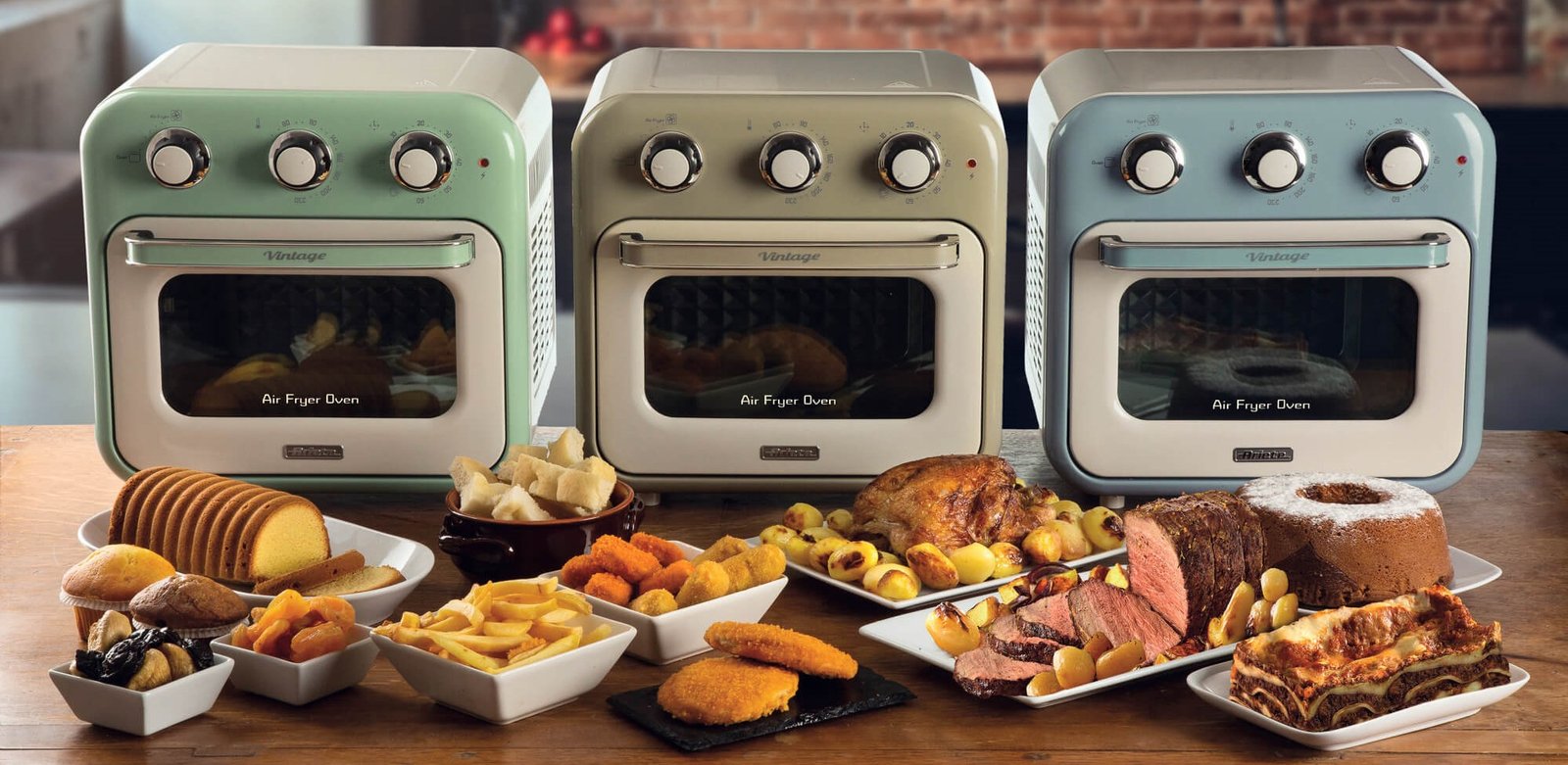 A câmara de ar da Air Fryer Oven Vintage envolve os alimentos em uma temperatura homogênea e cria seus pratos favoritos, doces e salgados, sem adição de gordura.