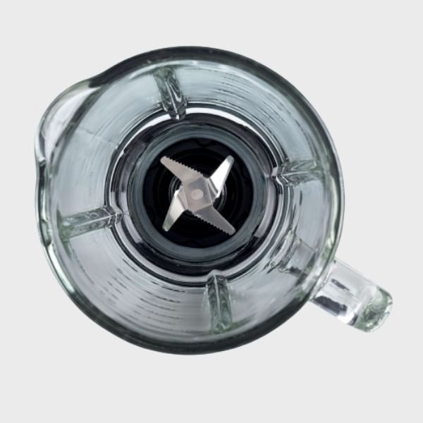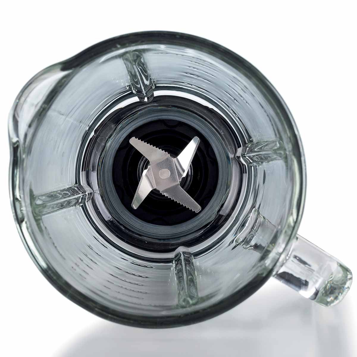 Copo de vidro graduado tanto em ml (capacidade até 1,5 L) quanto em xícaras, com tampa hermética e tampa removível para adicionar ingredientes.