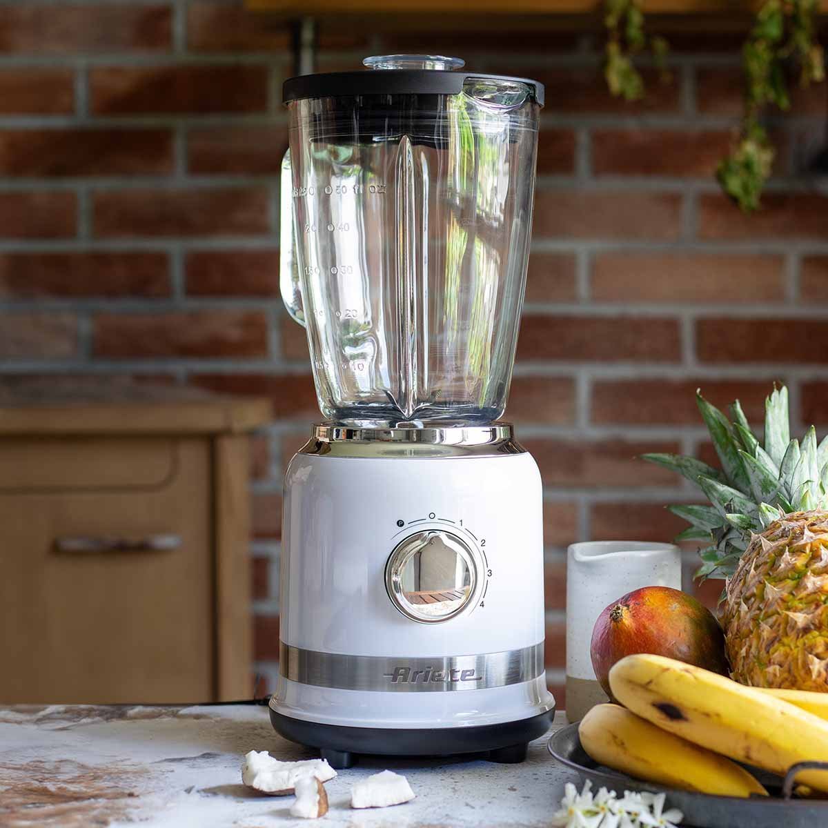 Um smoothie energizante , um smoothie cremoso ou uma raspadinha refrescante? Com o Liquidificador Moderna com copo de vidro da Ariete você pode preparar sua bebida favorita todos os dias, misturando os ingredientes e liquidificando-os uniformemente. O copo de vidro é resistente e as 4 lâminas de aço inoxidável, aliadas às 4 velocidades disponíveis e à Função Pulsar, são ideais para bater o que você preferir. Graças à prática tampa medidora, você também pode inserir os ingredientes diretamente no copo do liquidificador através do orifício na parte superior. O desempenho de um excelente liquidificador e o design típico da linha Ariete Moderna se unem em um liquidificador perfeito para dar um toque de estilo moderno à sua cozinha.